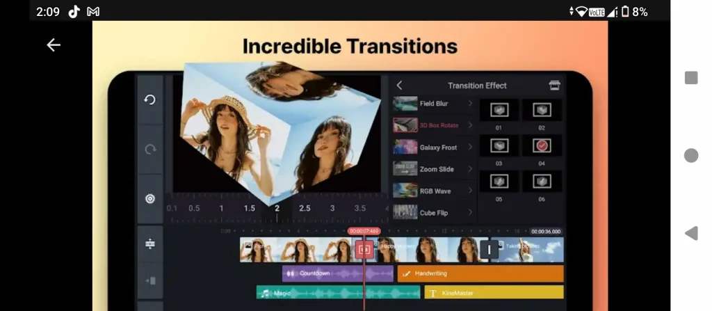 Catering to the demands and social media trends Kinemaster offers its users a wide range of transition effects. Have you seen tiktoks or instagram reels where a scene is replaced by another scene, or a costume is replaced by another. This is what we call transition in the world of post-production editing. Kinemaster hsa a range of 3D, Picture in Picture and ready-made transition effects.